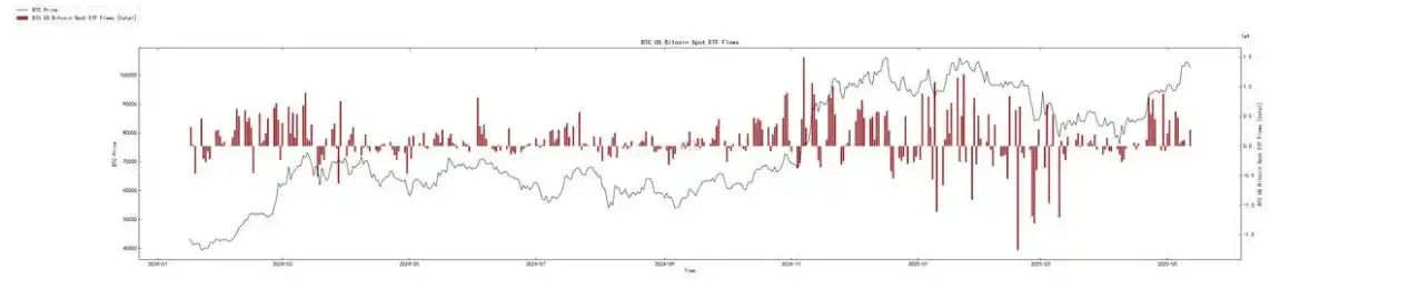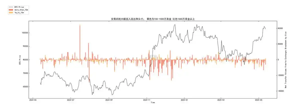 • 橙⾊条 (100-1000 万美元): 表现更为混合,但总体上在价格上涨过程中,并未出现持续的⼤规模净流⼊。最近⼏⽇,也出现净流出。