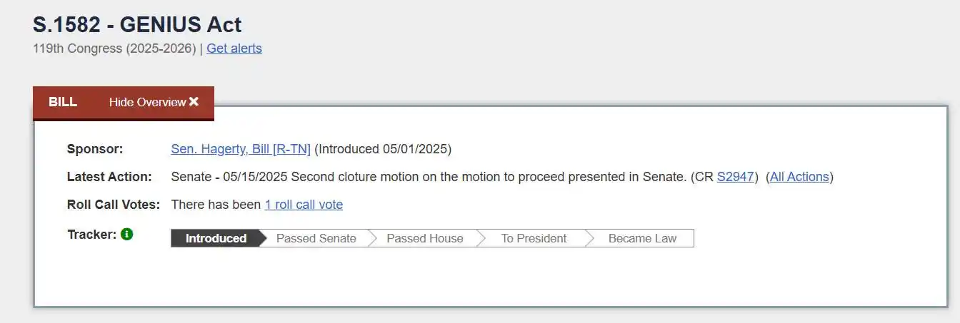 5 月 8 日,GENIUS Act 在参议院的终止辩论投票 (cloture vote) 中以 48:49 票意外失败,未能获得 60 票。但在 5 月 20 日上午,美国参议院再次投票,以 66 票支持、32 票反对的表决结果,通过 GENIUS Act 稳定币法案的终止辩论动议 (cloture)。