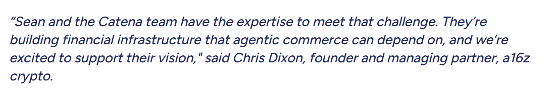 a16z crypto 创始人兼管理合伙人 Chris Dixon 说:Sean Neville 和 Catena 团队拥有应对这一挑战的专业知识。他们正在构建代理商务可以依赖的金融基础设施,我们很高兴能够支持他们的愿景。