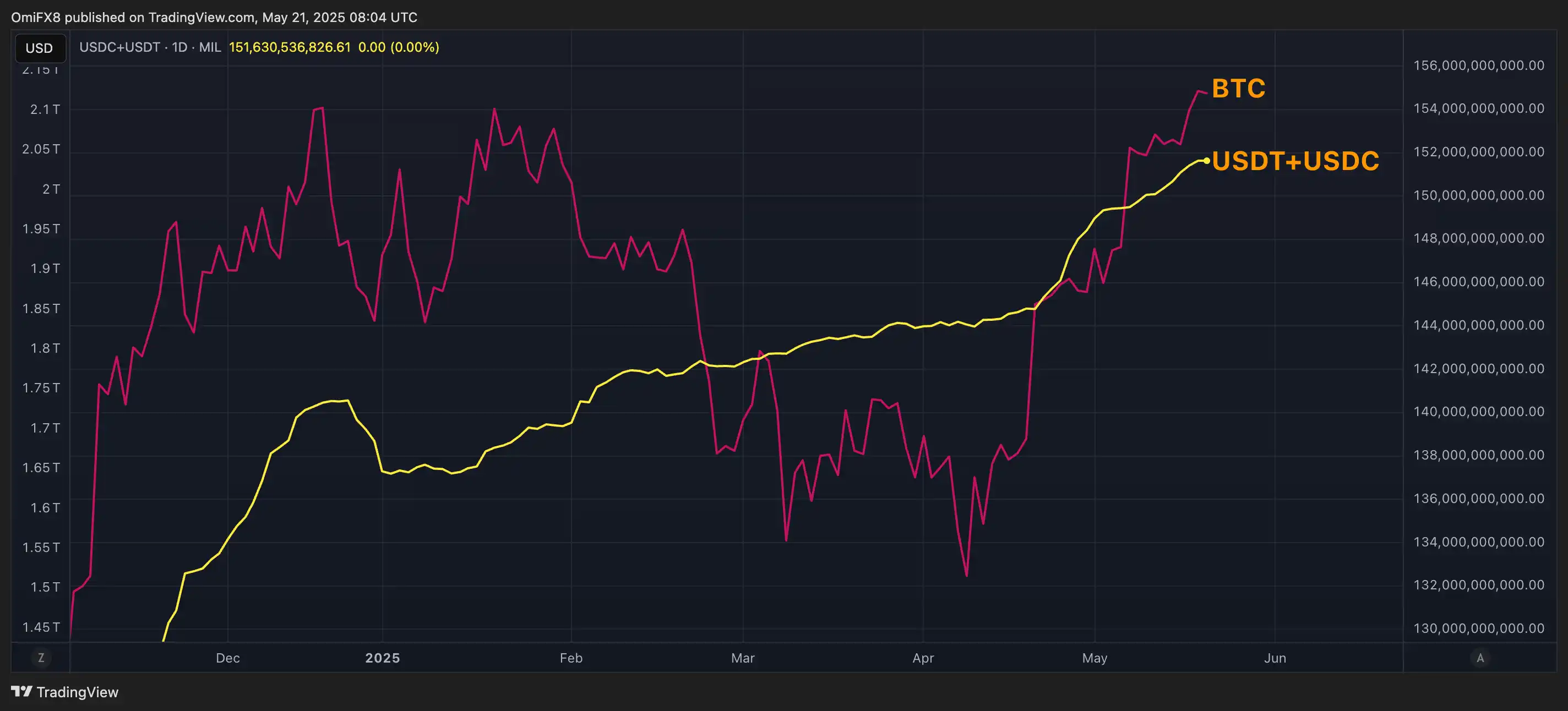 以美元计价的两大稳定币——USDT 和 USDC——其总市值已达到创纪录的 1510 亿美元。根据 TradingView 的数据,这一数值比去年 12 月至今年 1 月的平均市值(1390 亿美元)高出近 9%。