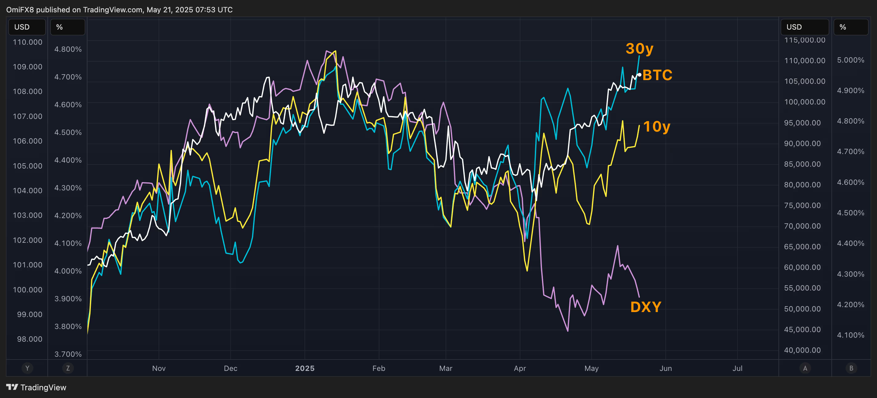 虽然 30 年期美债收益率已升至 5% 以上,回到 1 月水平,但市场普遍认为这对比特币和黄金是利好因素。