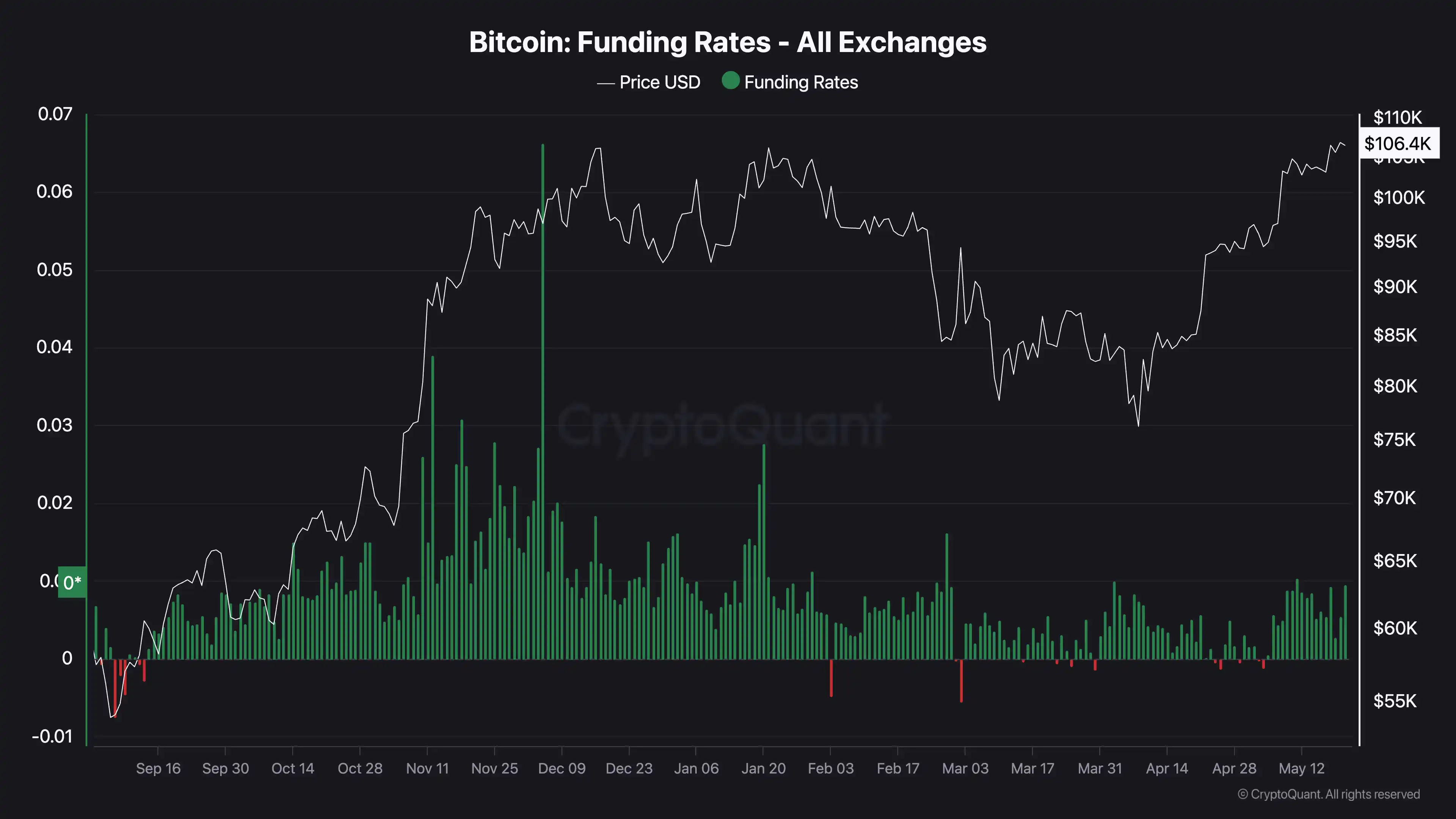 图表所示为资金费率,即持有永续合约的成本。正值表示多头愿意为持仓支付溢价,也即多头出钱给空头继续维持仓位。这通常被视为市场看涨的情绪指标。