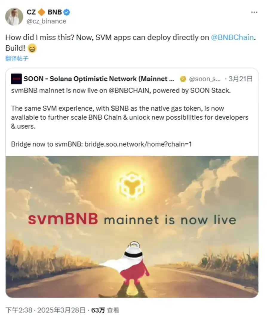 其私募轮融资由 Hack VC 领投,ABCDE、Hypersphere、SNZ Capital 等知名机构跟投,背后可见 Solana、Celestia 等核心团队成员的深度参与,体现了市场对其技术方向与社区理念的高度认可。值得一提的是,CZ 此前转发了 SOON 项目的官方推文,这一举动迅速点燃了市场情绪,许多「撸毛党」认为这是 SOON 在 SVM 赛道中巨大潜力的强力背书。