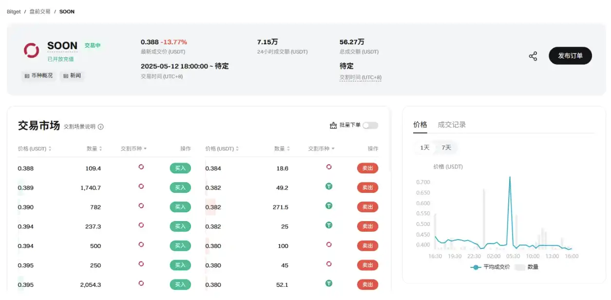 此前,SOON 代币已上线 Bitget 的盘前交易板块,供用户提前进行报价与交易。目前数据显示,SOON 暂时报价为 0.388 美元,其代币初始总供应量为 10 亿枚,总市值仅为 3.88 亿美元。若实际初始流通约在 15% 至 20%,对应市值为 6000 万至 8000 万美元。