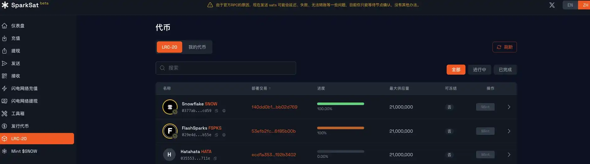 SparkSat是 Spark 协议上第一个功能齐全的网页钱包工具,其也是 LRC20 代币 SNOW 的项目方,并非由 Spark 官方运营。通过将助记词导入 SparkSat,用户可清晰查看自己的资产情况,也可直接通过 SparkSat 的前端进行比特币主网的存提款和 Spark 网络及闪电网络的交易。也可以直接使用该工具发行 LRC20 代币及一站式查看所有 LRC20 代币,堪称 Spark 协议的「Unisat」。