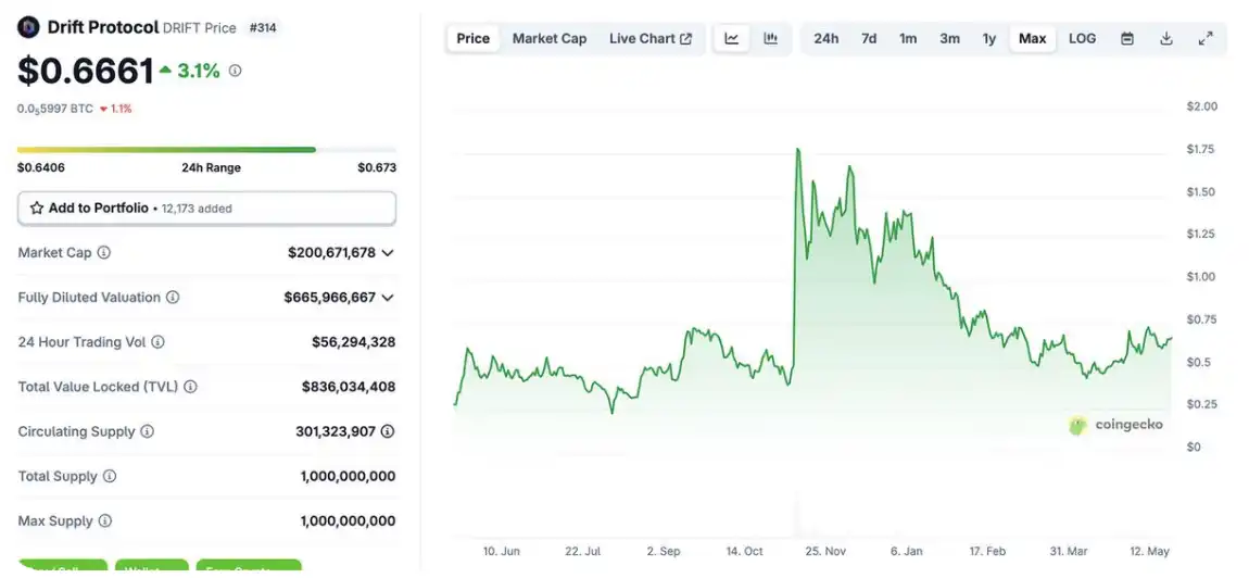 Drift 的价格走势(数据来源:https://www.coingecko.com/en/coins/drift-protocol)