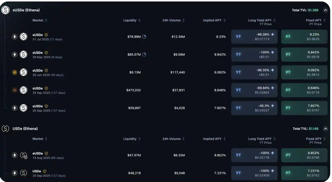 Pendle 的部分稳定币 TVL 示意图(数据来源:https://app.pendle.finance/trade/markets)