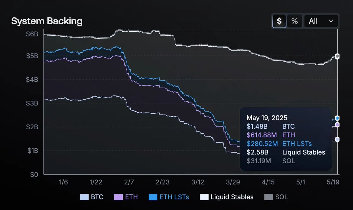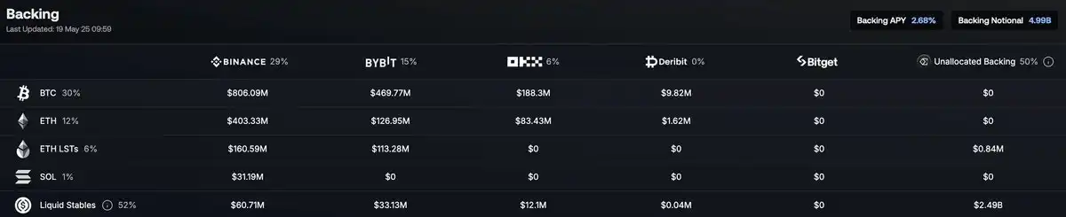 稳定币表面上看起来很无聊:1 美元就是 1 美元,对吧?但深入 Ethena 的内部机制,你会发现它一点也不简单。Ethena 没有用银行里的美元作为稳定币的支撑,而是采用了一套强大的资产组合,包括 ETH、BTC、SOL、ETH LSTs(流动性质押代币)以及价值 14.4 亿美元的 USDtb(一种由美国国债支持的稳定资产)。这些资产在主要衍生品市场上持续做空,以确保抵押品价格的任何波动都能被空头头寸的相应盈亏所抵消。