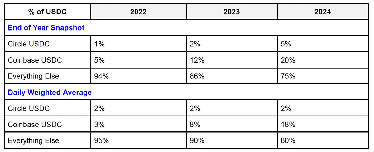 Coinbase 在 USDC 总供应中的占比正在迅速增长——2025 年第一季度已达到约 23%。而 Circle 的占比则保持稳定。