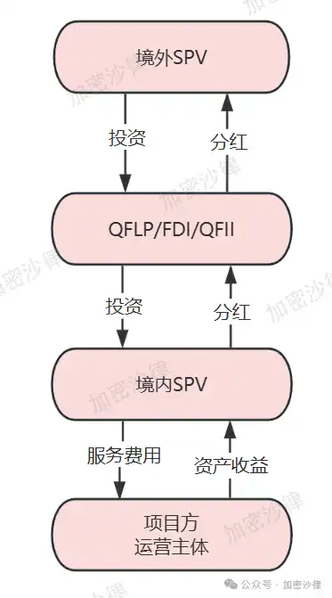 由于我国施行严格的外汇管制,因此在境外发行 RWA 所募集的资金不能直接转入国内的实际运营主体,需要由合规团队专门设计境外资金归集和流转的框架以及路径。根据加密沙律团队的项目经验,RWA 项目在境外通过发行代币完成融资之后,一般会将到境外的 SPV 的资金,通过资金通道完成归集后,最终转入实际运行主体。而该架构中的资金通道有以下三种选择: