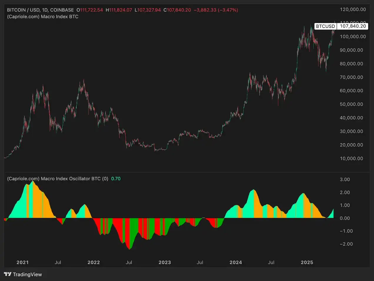 该综合指数使用 40 多项基本面、链上和市场指标来评估比特币的宏观阶段。该指数高于 0 表示扩张;指数低于 0 表示收缩或复苏。在之前的牛市周期中,该指标从负值区域过渡到强劲正值区域——在 2021 年接近 2 至 3 的峰值。在 2022 年触底时,该指标跌破 -1。截至目前,宏观指数约为 +0.7——显然处于增长阶段,但仍远低于狂热的极端水平。