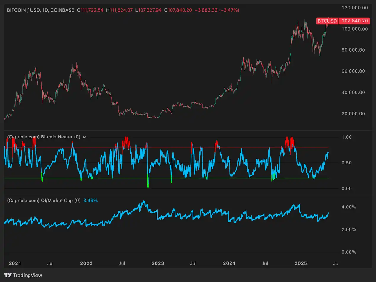 Bitcoin Heater 指标将衍生品情绪(资金费率、基差、期权偏斜)整合为一个 0 到 1 之间的单一指数。该指标接近 1.0 表示泡沫、激进的多头头寸和高杠杆。该指标在 0.0 至 0.3 左右表示市场降温或避险情绪。在之前的周期(尤其是 2021 年),该指标常常在局部调整前突破 0.8。但在强劲的牛市期间(2020 年第四季度至 2021 年第一季度),该指标一直保持高位,但并未立即引发反转。截至 2025 年中期,该指标约为 0.6 至 0.7,处于温暖状态,但尚未过热。