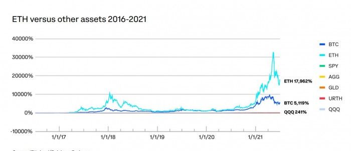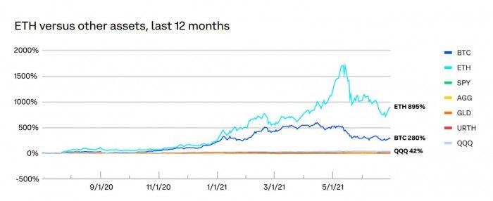 根据加密货币交易所Coinbase 本周一公布的半年度回顾[PDF],在2021年上半年由于大型投资者分散投资于以太坊区块链的原生代币,以太坊市场增长速度是比特币的三倍。