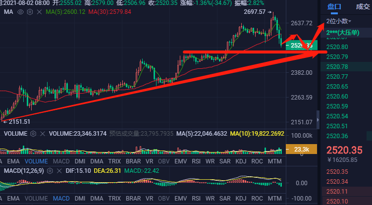 以太坊的话趋势还是较为强势的,周末的大幅上涨说明市场主流资金开始向以太流入,不出意外的话短期不会那么快流出,接下来以太坊的走势还是会活跃于大饼。行情上涨突破之后回踩的力度要小一些,还是在前期高点压力位上方,也就是说之前的高位2480一线支撑位置有效。接下来以太只要守住上行趋势线的支撑还是完好运行的上升趋势当中,周末的回踩没有跌破任何强支撑和趋势线,还是较为强势的,调整的走势咱们正确看待,下方重点关注2480支撑,上方依然还看2600关口突破情况。