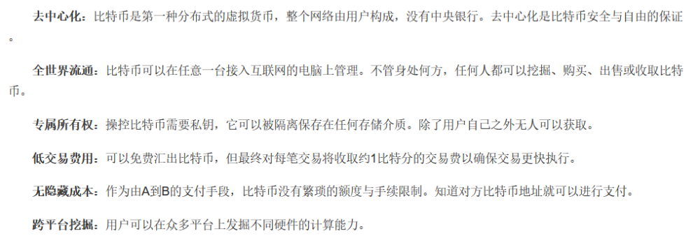 比特币的去中心化的技术特点保证其交易的安全和无法被人操纵;运用密码学的设计确保了交易的安全性和匿名性;而其总量受限的特点有让它具备了稀缺性。