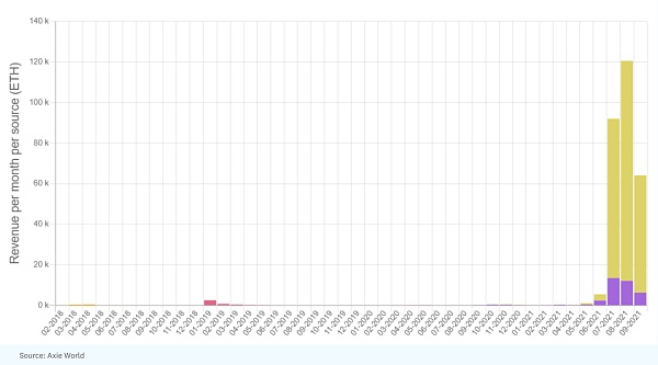 Axie 是一个广受欢迎的区块链游戏,玩家在游戏中购买宠物 NFT(Axies),繁育它们、让它们战斗,然后交易它们。这一切都发生在游戏中,但每个用户实际上拥有他们所创造或购买的 Axies。这个游戏在过去的几个月里人气爆棚,在7月和8月赚取了总共超过20万个 ETH(目前价值8.6亿美元)的收入(这个数字在后来有所下降,引起了激烈争论,下文会详细说明)。
