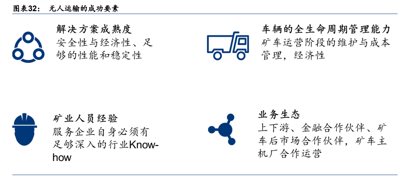 3)资深矿业人员的加盟。无人运输运营模式下,客户方人员的参与度几乎可以忽略。服务 企业自身必须有足够深入的行业 Know-how,团队中资深矿业人员的加盟必不可少,并以足 够合理的团队,跑通无人运输运营服务的经济模型,实现业务现金流的正向反转。