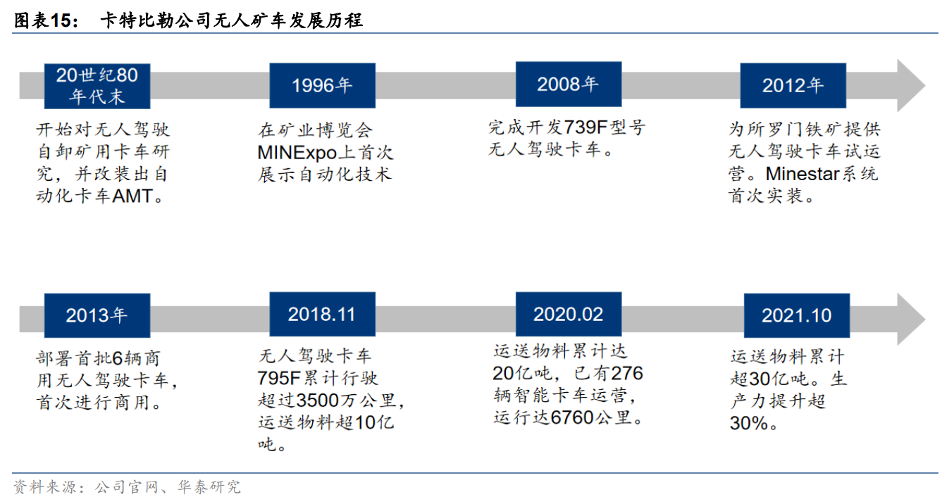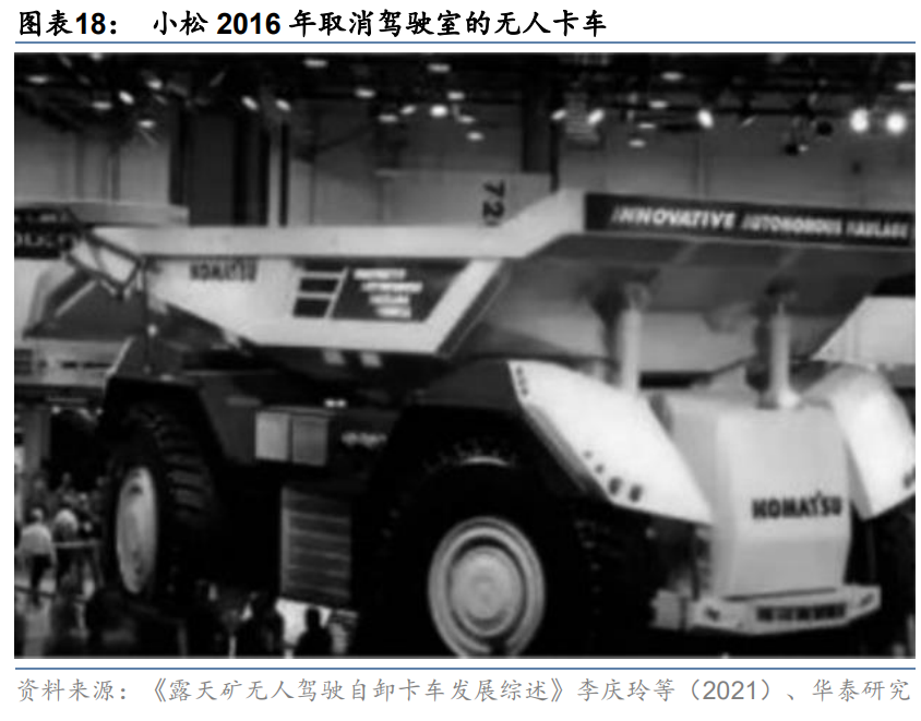 卡特彼勒和小松在海外的实践,一方面充分证明了矿山无人运输方案的价值和可行性:据 淡水河谷公司,无人驾驶使燃料成本下降10%,车辆维护费用降低10%,轮胎磨损降低25%。 据澳大利亚铁矿石出口商 FMG,无人运输效率较传统人工运输提高 30%,据澳大利亚矿业 技术集团,无人矿卡可使每辆矿卡每年多工作 500 多小时。另一方面其主机厂的身份,以 及其自动驾驶技术大部分衍生自有人车的 FMS(Fleet Management System),也即整体无人矿山系统的一部分,这也给其发展带来局限性:1)其方案全部针对矿用卡车,缺乏对宽 体车的方案;2)作为矿卡主机厂,只做前装市场,不针对存量车提供服务;3)技术方案 相对保守,对矿山的基础条件与场景要求较高,普适性低;4)价格较为昂贵,大为降低其 经济价值;5)智能驾驶方案属于整体矿山自动化方案,独立性较弱,影响其采用相对灵活 的商业模式;6)国产化替代趋势和复杂的国际政治经济环境带来的数据安全考量。以上因 素限制了其进入中国市场,更给国内矿山智能驾驶厂商提供了足够的发展空间,乃至为其 后续进入海外市场参与竞争提供机会。