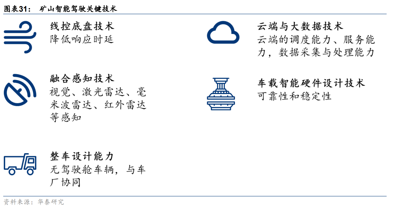 1)线控底盘技术,矿车体型巨大,重量更是数以百吨计,响应时延长,其车辆控制技术与 乘用车大相径庭,线控底盘与相关技术前瞻能力至关重要;