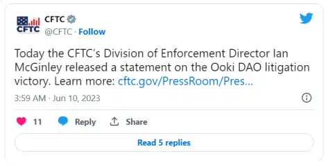 2023 年 6 月 9 日,英国商品期货交易联合会(CFTC)公布其对于 Ooki DAO 在司法方面方面取得了「围剿式(Sweeping Victory)」胜利,为 DAO 做为被诉行为主体而负法律责任开辟了从未有过的例子。
