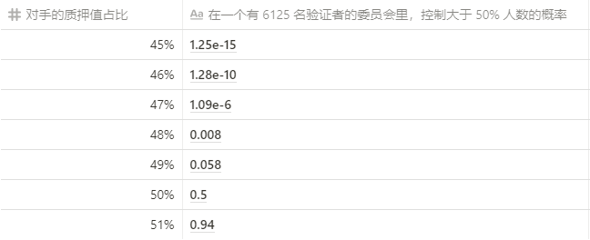 更正式地说,拥有 p% 质押量的恶意行为者控制 N 名验证者大小委员会的 50% 以上的概率遵循二项式分布 (其中 k = N/2 ):