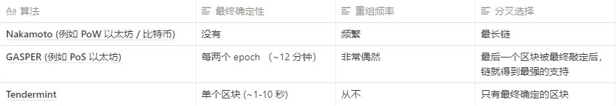 重组 (reorg) 是这样一种事件——本来属于权威链的区块变成不再是权威链的一部分了,因为有一个竞争区块把它击败了。最终确定性是这样一种情况——分叉选择规则强有力地支持某个区块,以至于该区块在数学上不可能被重组 (或至少是经济行不通)。