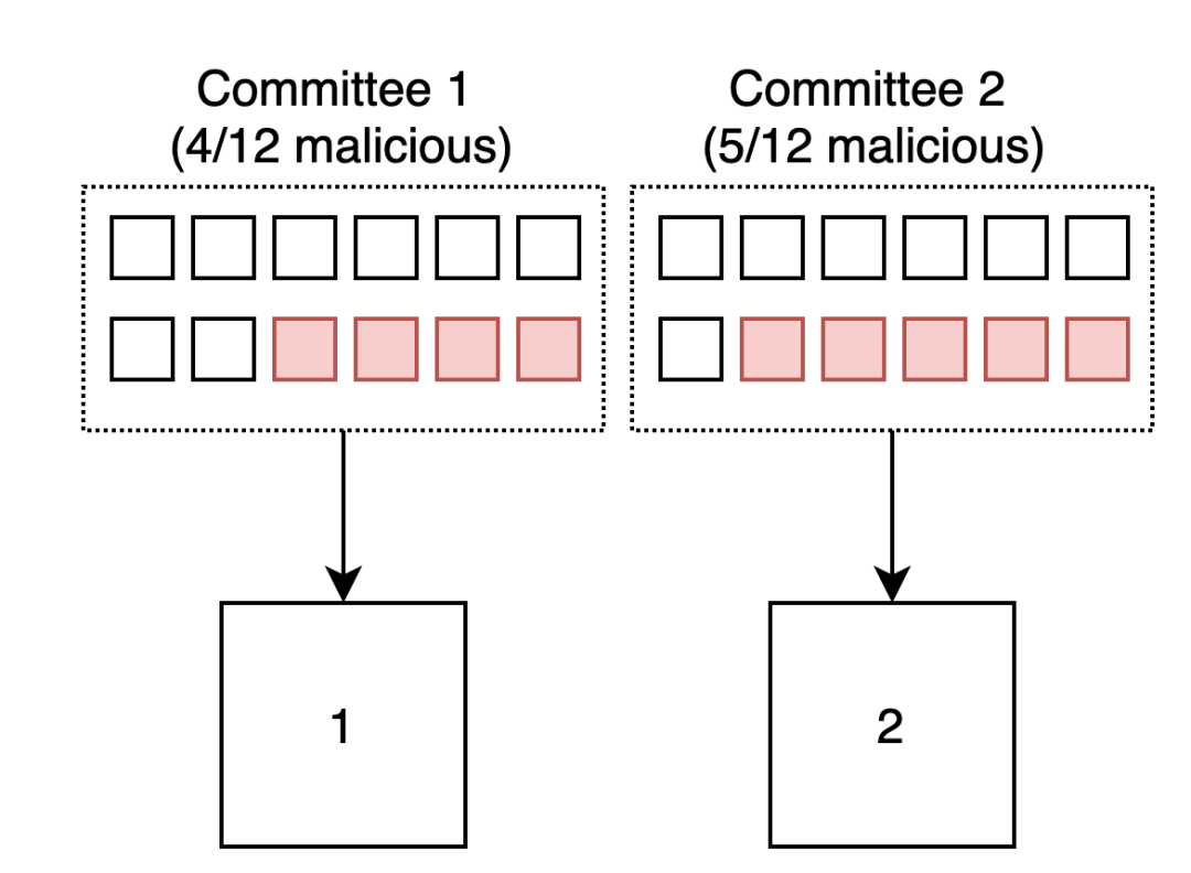 为了更好理解为什么是这样,让我们看看以下这个例子:有 2 个 slot 和 24 名验证者,其中 9 名是恶意的。验证者被分成 2 个委员会,经过随机混洗,对手不太可能可以控制他们被分配到的委员会人数的 50%,更不能实现重组。