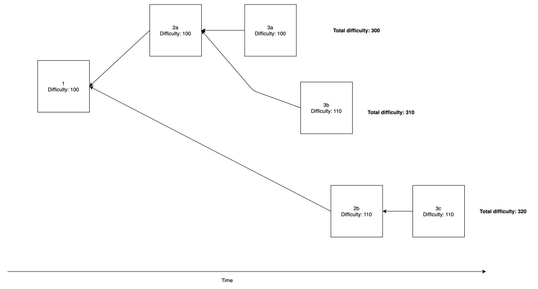 在以太坊这样的 PoW 区块链里,我们通常看到的是「最长链规则」(或更准确来说,是「最高总挖矿难度规则」)。这意味着,当客户端看到两条区块链时,它会选择总难度 (即该链里所有区块的难度总和) 最高的那条。