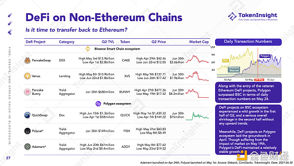 与此同时,Polygon 生态系统的 DeFi 项目也在 4 月份奠定了基础。 5月19日,Polygon 生态虽然受到市场冲击,但仍保持相对稳定的增长。并且在 5月24日,随着老牌以太坊 DeFi 项目的加入,Polygon 的日交易量超过了BSC。