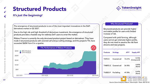 结构化产品的出现是 Q2 DeFi 衍生品市场最重要的创新之一。而 Ribbon Finance 是目前唯一基于衍生品的结构化产品。本篇将专门讨论 Ribbon Finance,因为目前暂无其他项目可供研究,TokenInsight 的季报无任何充值字眼,请放心查阅。