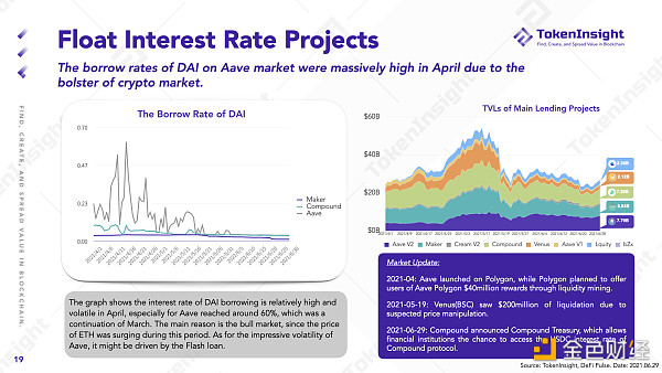 4月中旬 Coinbase 上市的篝火,无差别映红了每一个参与者的脸庞。体现在 DeFi 的借贷市场上来看就是,AAVE 上的 DAI 借贷率一度达到60%,并在4月下旬开始逐渐回落。