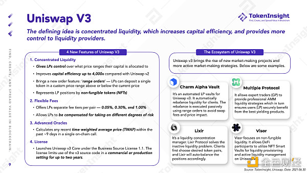 另外图的右侧 TokenInsight 还列举了几个 Uniswap V3 新的做市项目,他们分别是:Charm Alpha Vault、Multiple Protocol、LixiR、Visor。