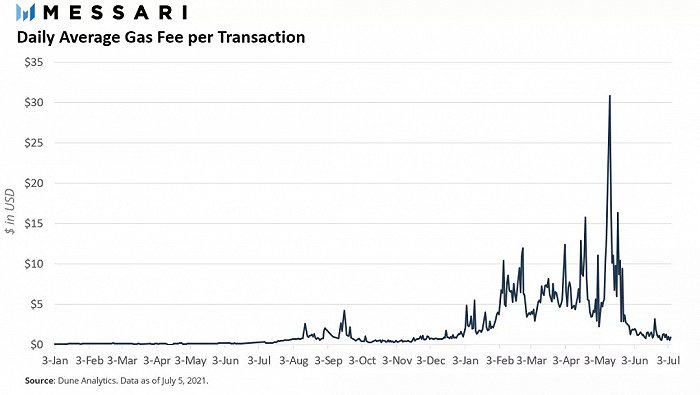 最后,Polygon 短暂 TVL高峰的第三个潜在原因可能是由于以太坊的费用环境不断改善。每笔交易的平均gas费已从 5 月中旬的每笔交易高达 30 美元的水平降至 2020 年 12 月的水平。下降的部分原因是其他智能合约平台(如 Polygon 和 BSC)的活动增加。