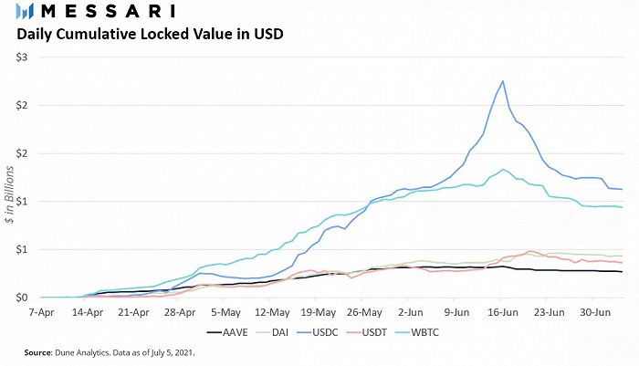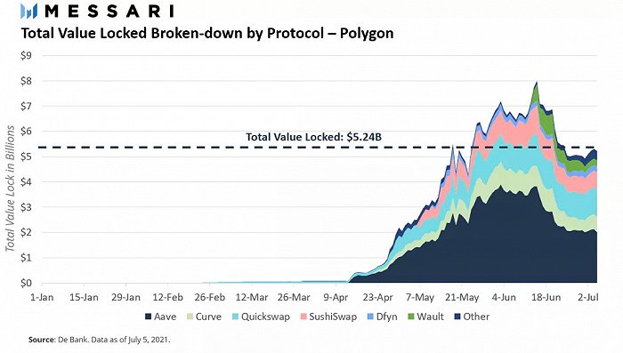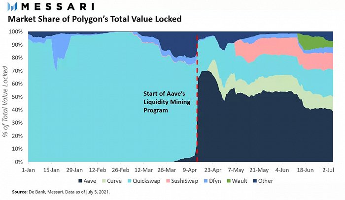 因此,这三个协议占 Polygon 锁定的所有价值的近 65%。特别是,由于其流动性挖矿计划,Aave 在 TVL 的市场份额爆炸式增长,几乎立即从不到 10% 上升到 70%。