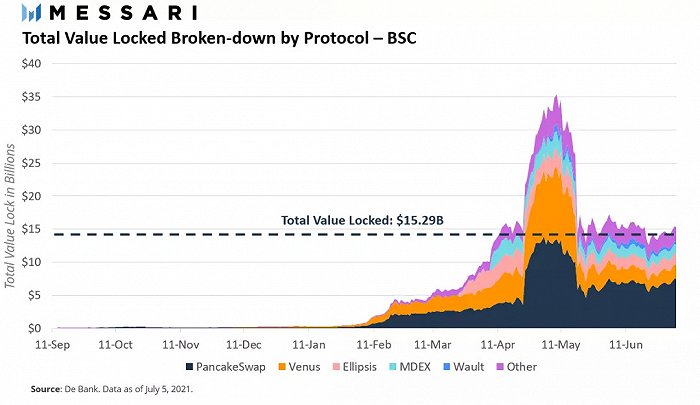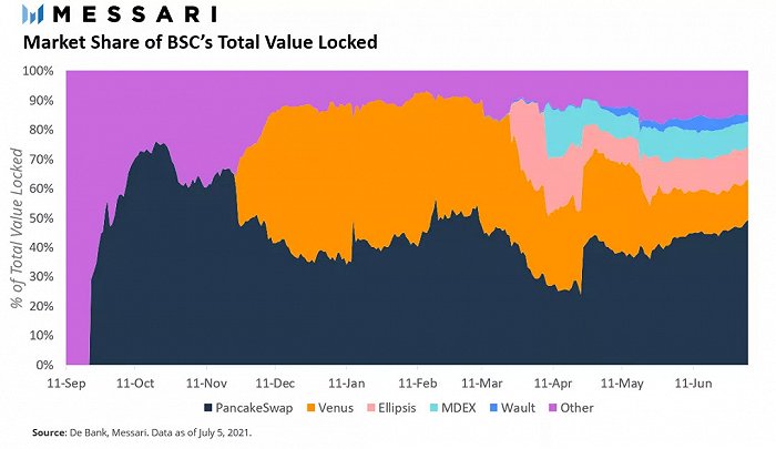 从 2020 年 12 月到 2021 年 4 月,这两个协议控制了平台中大约 90% 的资产。4 月中旬,随着新协议的推出,TVL 开始扩展到其他协议,如 MDEX、Ellipsis Finance 和 Wault。然而,截至7月5日,PancakeSwap和Venus重新夺回了BSC生态中的主导地位,控制了超过65%的锁定在智能合约中的资金。