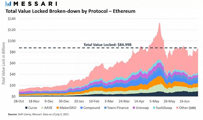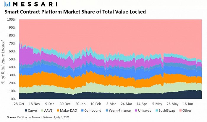 因此,以太坊的 DeFi一直是用户资金的主要目的地。截至 7 月 5 日,大约 47% 的 TVL 属于六个主要的 DeFi 协议:Curve、Aave、MarkerDAO、Compound、Yearn、Uniswap 和 SushiSwap。其余 53% 分布在其余 169 个应用中。