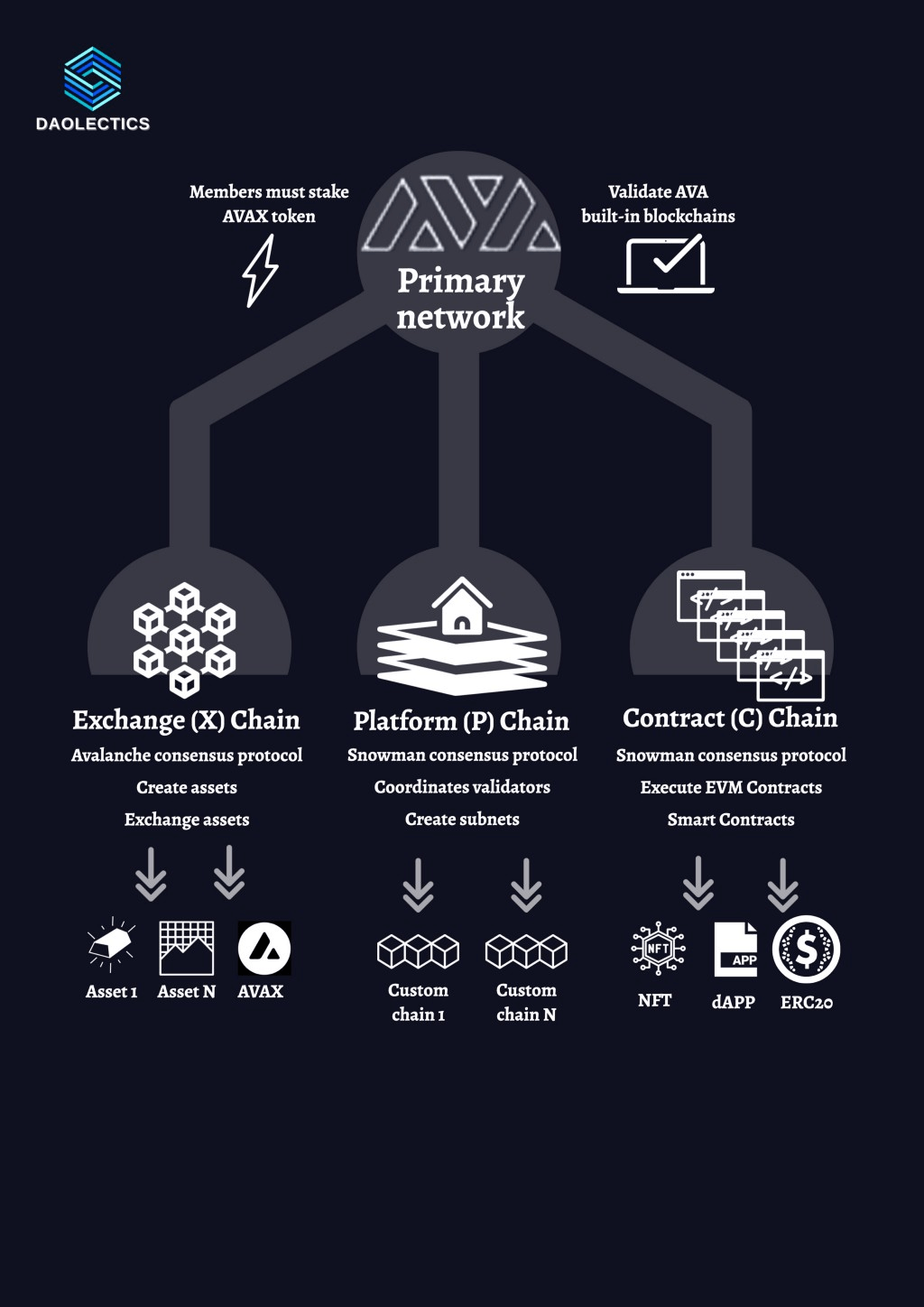 Avalanche 预配置了三个区块链: 交易链(X-Chain)、 平台链(P-Chain)和 合约链(C-Chain)。