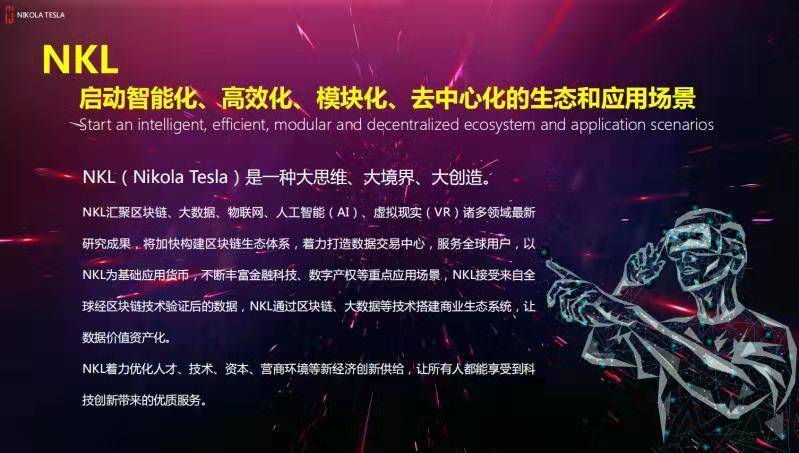 NKL(Nikola Tesla)是一种大思维、大境界、大创造。 NKL汇聚区块链、大数据、物联网、人工智能(AI)、虚拟现实(VR)诸多领域最新 研究成果,将加快构建区块链生态体系,着力打造数据交易中心,服务全球用户,以 NKL为基础应用货币,不断丰富金融科技、数字产权等重点应用场景,NKL接受来自全 球经区块链技术验证后的数据,NKL通过区块链、大数据等技术搭建商业生态系统,让 数据价值资产化。 NKL着力优化人才、技术、资本、营商环境等新经济创新供给,让所有人都能享受到科 技创新带来的优质服务.