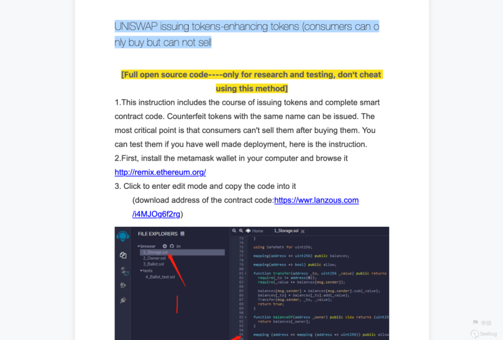 作为当下区块链热门话题,很容易吸引人们的注意。攻击者利用人们贪图便宜的好奇心理。使用所谓的 教程一步一步带用户入坑。以当下区块链中最火的类为主题,分享了 教程。如果用户不注意看合约代码,很容易掉入攻击者精心构造的陷阱中去。成为真正的。