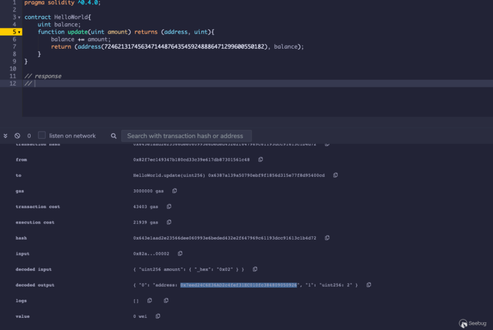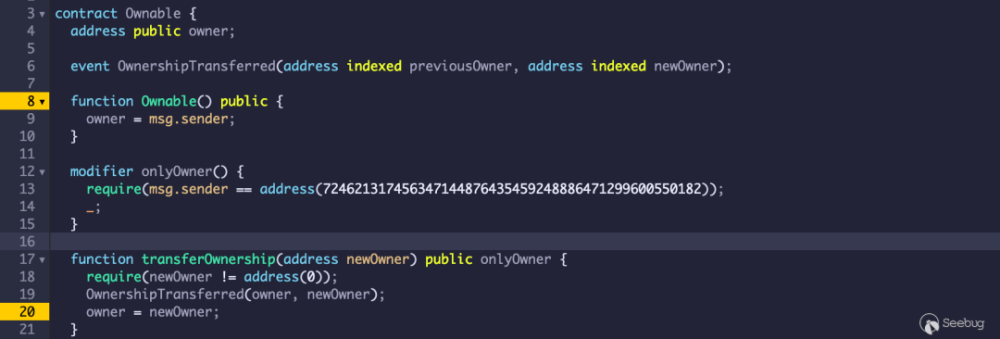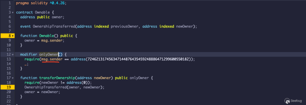 通过合约代码第13行可知,属性中,只有地址为即前面提到的用户可以通过校验,而且是硬编码。这也是原文攻击者为什么使用了以太坊地址的uint160格式来编码地址,而不是直观的十六进制地址。