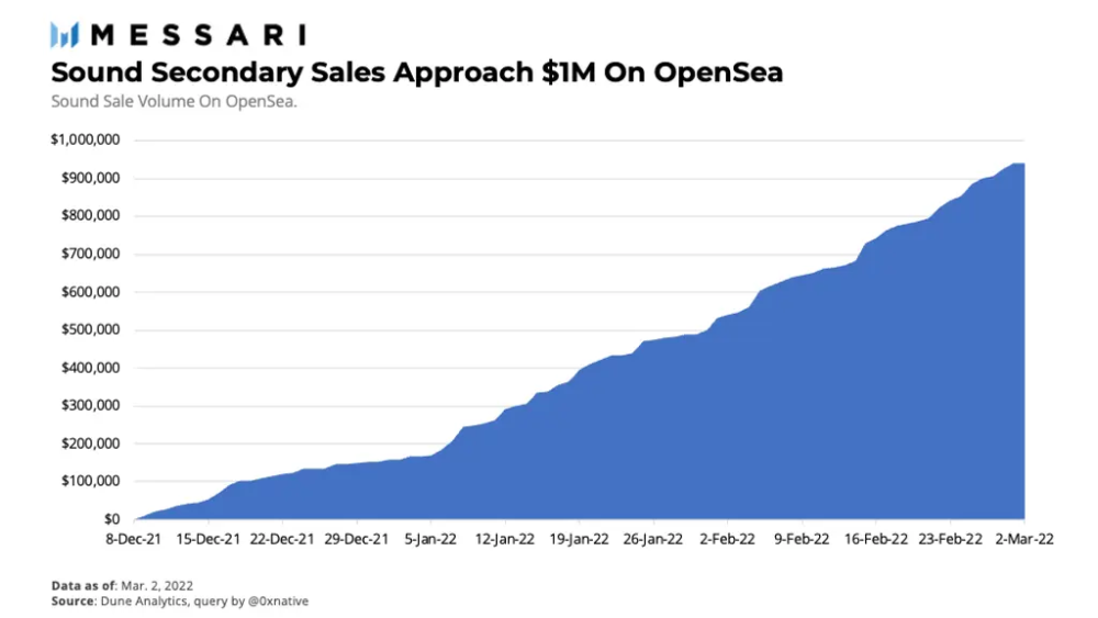 Sound的销售只占OpenSea交易量的一小部分,而蓝筹NFT收藏品占据了大部分份额。当交易者能够看到围绕音乐或音频NFT的更多流动性时,可能会勾起人们的兴趣。
