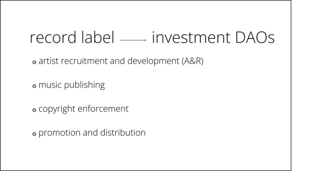 音乐收藏家DAO最终将通过以某种方式承担所有这些功能来充当唱片公司,这是一个自然的进步,因为投资NFT通常是对创作者的投资。