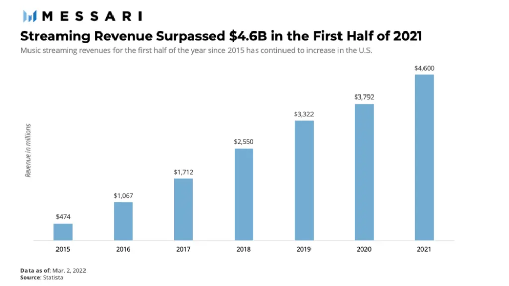 当音乐从模拟音乐变为数字音乐时,它就永远改变了。在硬件层面上,录制和制作音乐变得更加容易--艺人们现在完全能够在家里用更多的便携式设备和软件来做这件事,而这使得新的流派和多样化的艺人进入了这个舞台。在数字化之后,实体CD的销量暴跌,艺人们不得不适应使用流媒体服务,并将更多精力投入到现场表演中。然而疫情让这一切都暂停了,艺人们只能开始进行直播活动。互联网催化了从磁带、CD和MTV音乐视频到流媒体世界的转变,以及现在基于NFT的音乐。