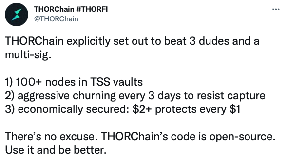 THORChain 在这方面做得特别好, 但是事实是否是这样我们仍然要查证, 不过它总归是比口头上说自己安全却完全依赖着几个风险未知的多签的应用要好很多.