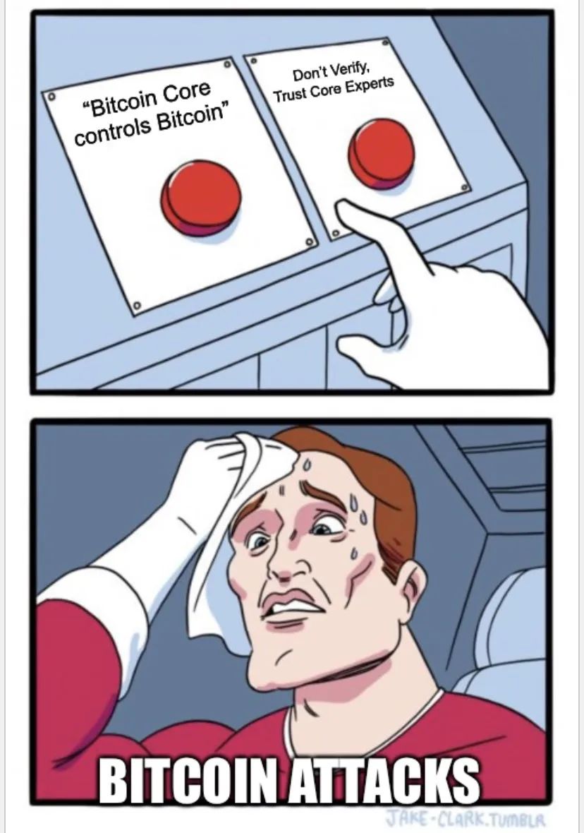 但是比特币 Core 可能会被这些人控制: GitHub 内部员工 (偷偷篡改), 和几个开发者的密钥 (而不是那几个开发者本人). 其中开发者有经历过因为舆论退出, 或者被其他人踢出的情况. 当开发者的推送不被通过时, 他们就有可能会直接硬来, 进行分叉.
