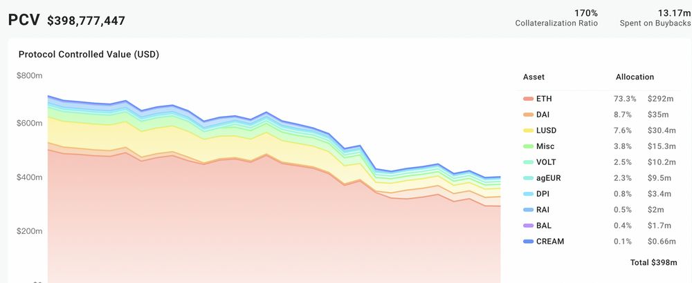 一开始的FEI以ETH铸造,现在已经改为DAI,PCV中的绝大多数资产依然为ETH。根据Fei Protocol官网数据,协议铸造的FEI约为3亿,用户铸造的FEI约为2.3亿。PCV持有的资产价值3.98亿美元,其中ETH占比73.3%,DAI占比8.7%,LUSD占比7.6%。