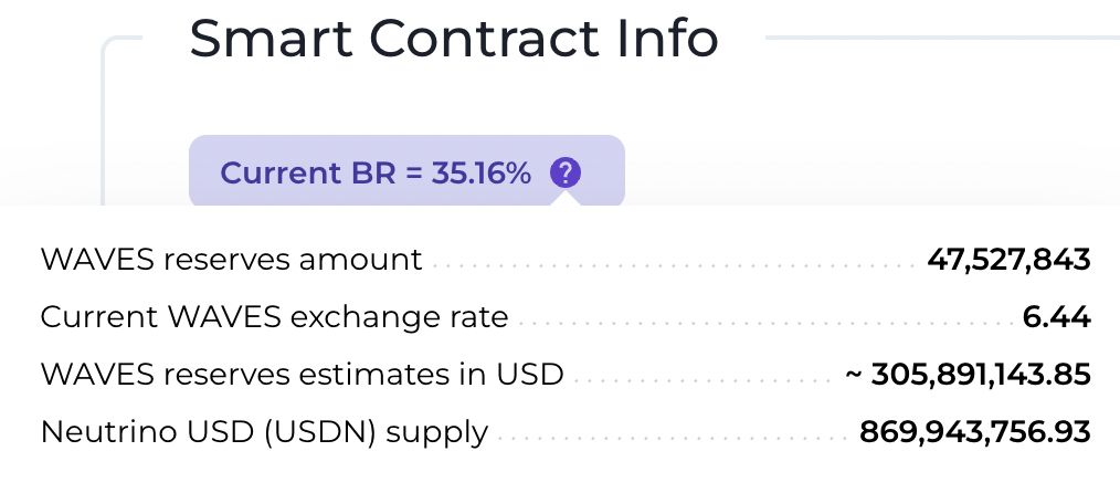 USDN已经持续维持小幅度的脱锚,当前价格为0.976美元。Neutrino官网显示,USDN发行量为8.7亿,而对应的WAVES储备金价值为3.06亿美元,抵押率只有35.16%。