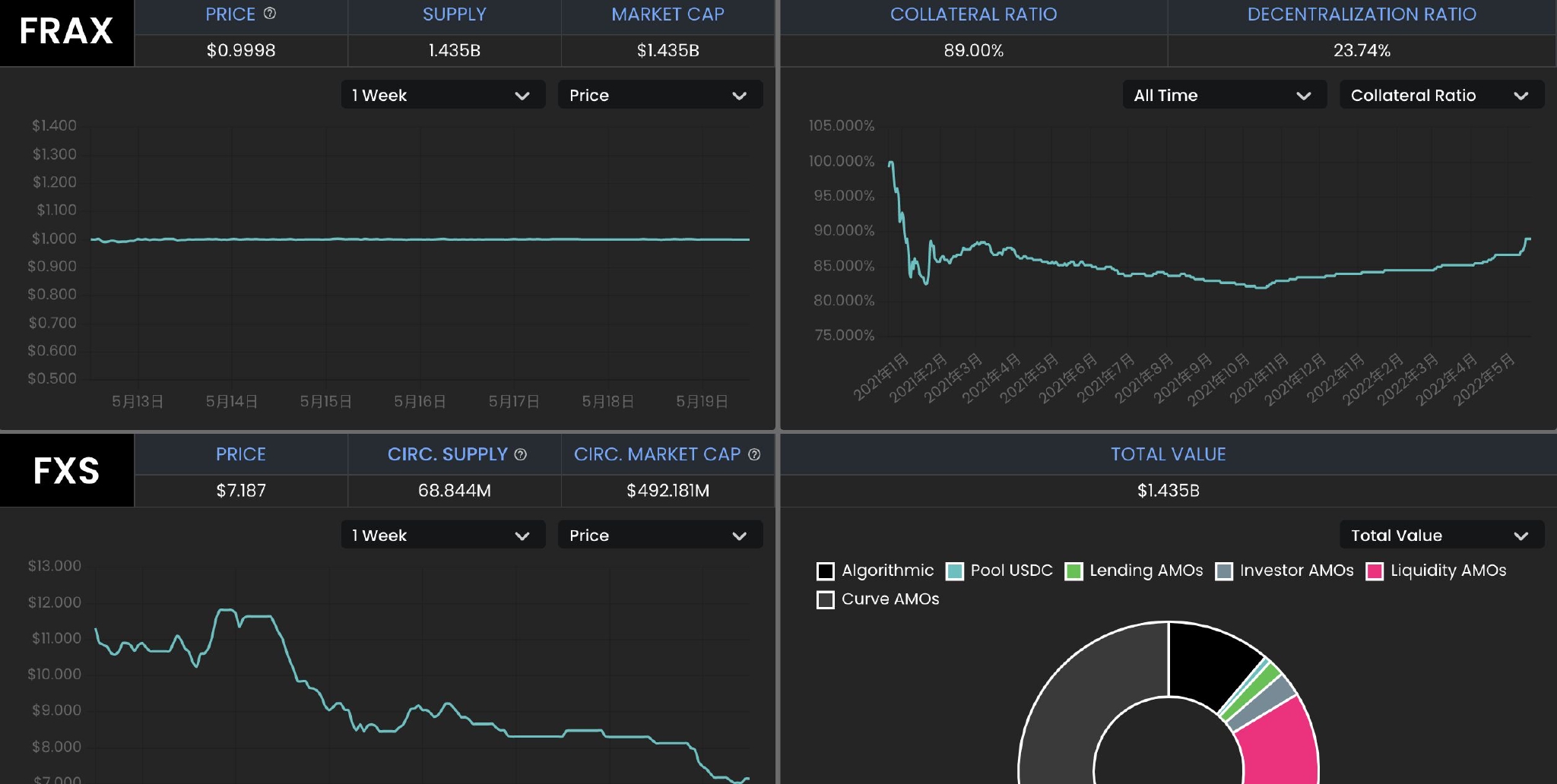Frax是一种部分算法稳定币,铸造FRAX需要一部分的USDC和一部分FXS(Frax的治理代币),协议允许用户用1美元的USDC+FXS铸造1 FRAX,也允许销毁1 FRAX赎回1美元的USDC+FXS。USDC的占比称为抵押率,FXS对应算法部分。若FRAX的需求高,算法部分的占比升高;若FRAX需求不足,算法部分的占比下降。从5月1日到现在,FRAX的流通量从27亿下降到14.9亿,降幅44.8%。