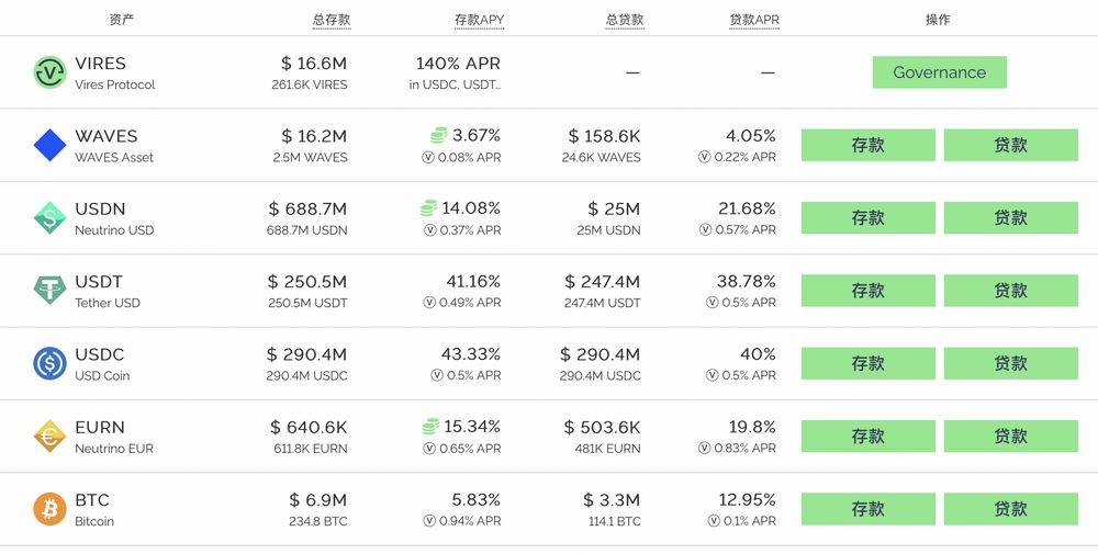 Vires Finance是Waves生态的一个借贷协议,允许WAVES、USDN、USDT、USDC、BTC、ETH等代币间的借贷。数据显示,Vires Finance中的USDN存款约有6.89亿,借款只有2500万,超过76%的USDN在Vires Finance中闲置,这部分USDN也可以获得Neutrino的质押奖励。
