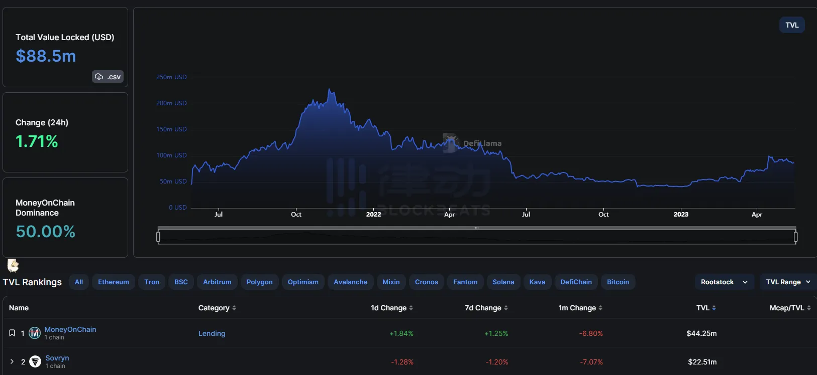 现阶段 Rootstock TVL 大约为 8850 万美金,在其中借贷合同 MoneyOnChain TVL 大约为 4425 万美金,Sovryn TVL 大约为 2250 万美金。
